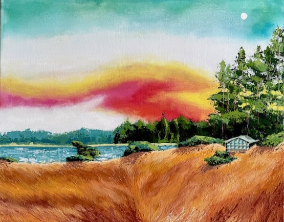 Sarah moved to Vancouver Island in 2013 and slowly started to share her artwork with others. She established an art instagram site in 2019 and had her first solo art exhibit in November of 2023, selling 13 paintings. She is inspired by nature and often incorporates landscapes and trees and cloud formations into her work.